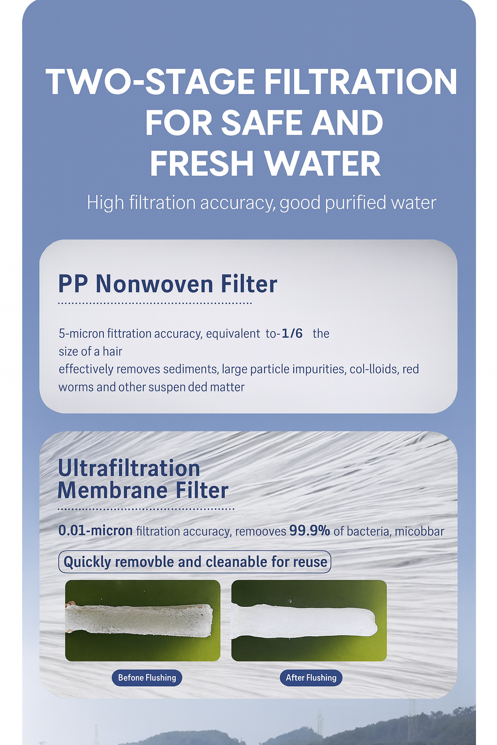 Multi-Stage Filtration: Equipped with PP cotton, nanofiltration, and activated carbon + ultrafiltration membranes to effectively remove sediment, impurities, and contaminants.