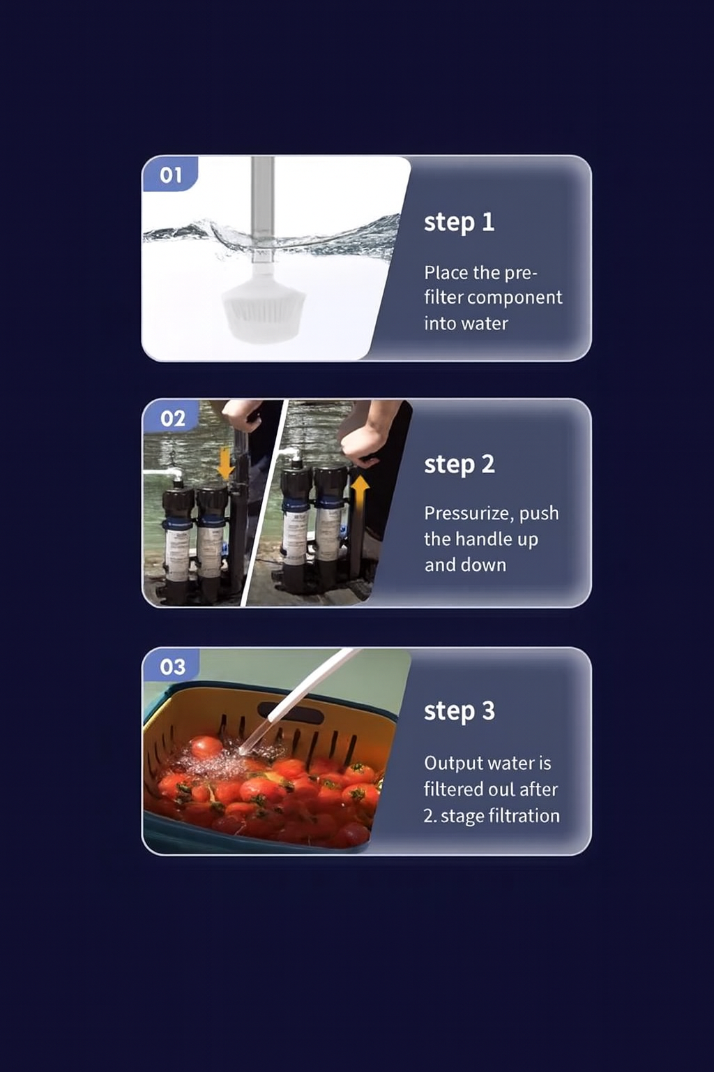 Stay hydrated anywhere with the Meena Outdoor Hand Pump Water Filter, designed for outdoor enthusiasts, survivalists, and emergency preparedness. Compact and powerful, it delivers safe drinking water from rivers, lakes, rainwater, or wells β no electricity required.